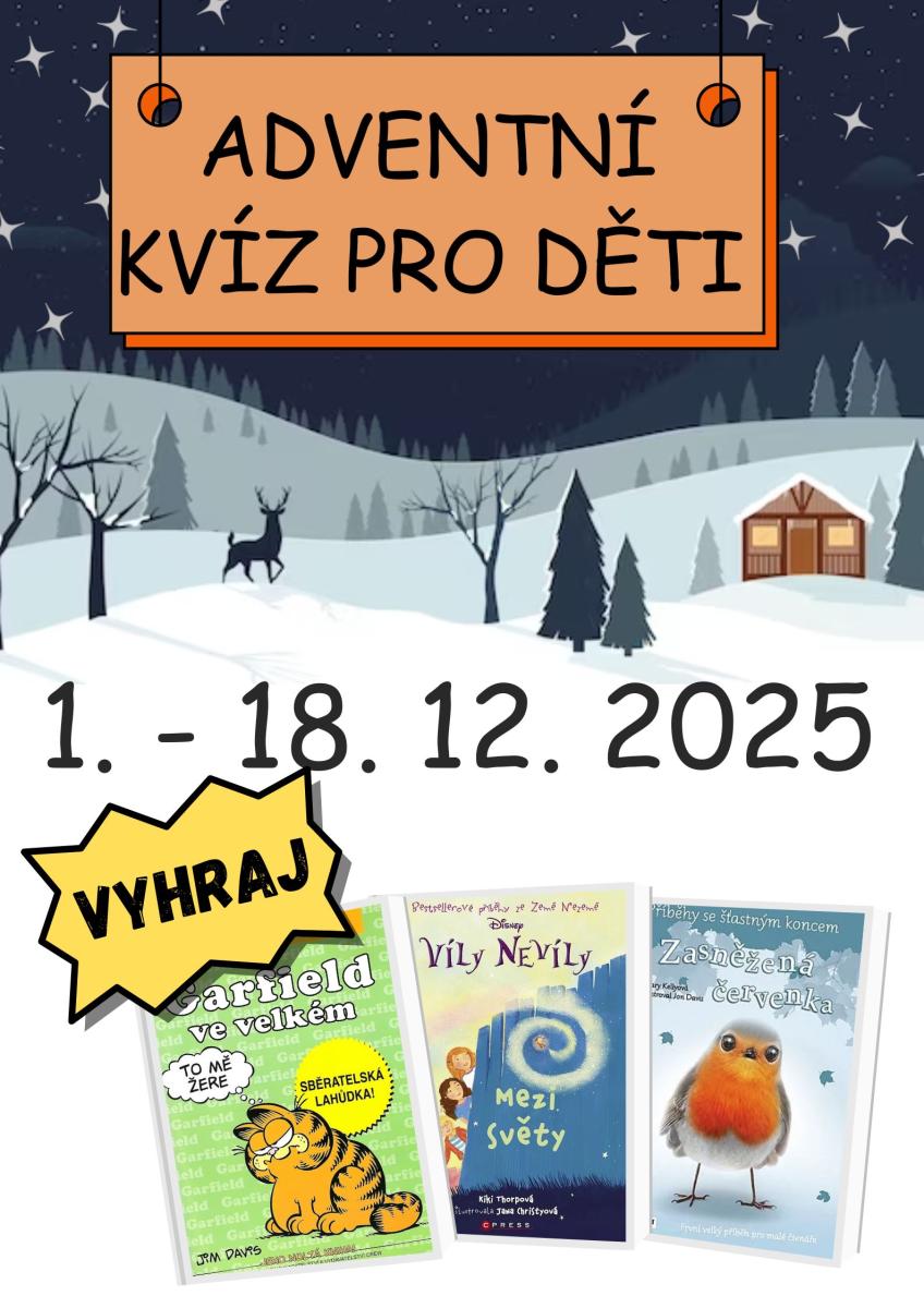 abyste si zkrátili nekonečné čekání na Ježíška, připravili jsme si pro Vás ADVENTNÍ KVÍZ pro všechny naše malé čtenáře. Vítěze samozřejmě čeká odměna. Soutěž proběhne na pobočce ČANKOVSKÁ od 1. 12. 2025. Více informací na pobočce.