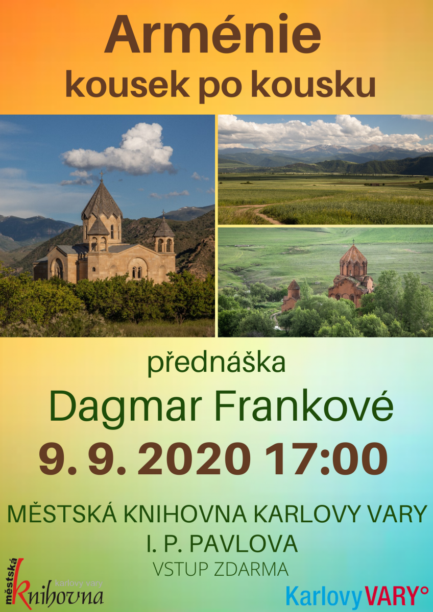 rádi bychom Vás pozvali na naši první podzimní přednášku, uskuteční se 9. 9. 2020 v půjčovně pro dospělé na I. P. Pavlova a začne v 17:00. Společně s paní Frankovou "vycestujeme" do Arménie.