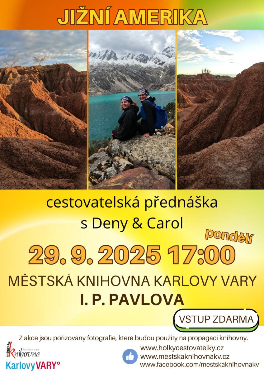 rádi bychom Vás pozvali na přednášku Deny a Carol, milých cestovatelek, které své cesty berou s humorem, a přesně takové jsou i jejich přednášky. Tentokrát se vydáme na cestu Jižní Amerikou, podíváme se do Kolumbie, Ekvádoru, Peru nebo Brazíle. Kromě tradičního poznávání místní kultury, památek a obyvatel, zavzpomínáme na Českou republiku pomocí našeho poctivého českého piva nebo řízků...