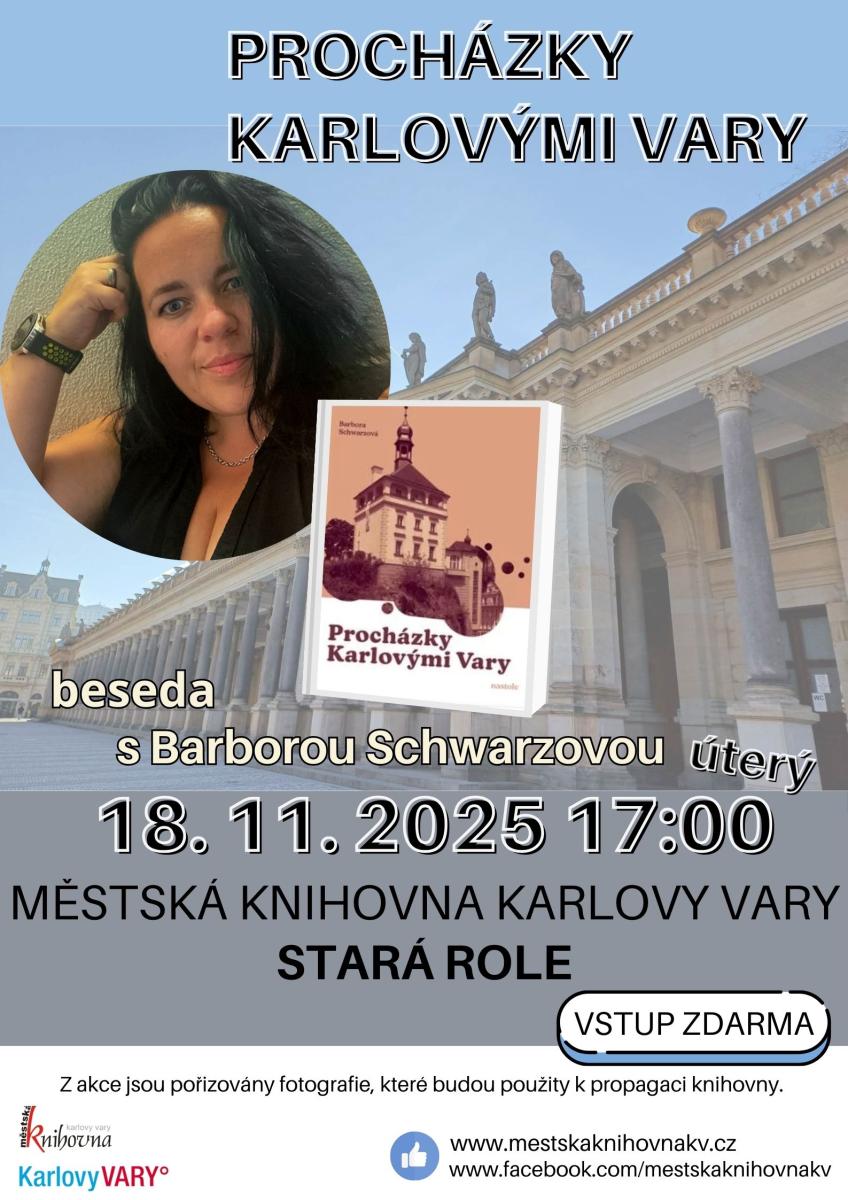 rádi bychom Vás pozvali na besedu s Barborou Schwarzovou, autorkou knihy PROCHÁZKY KARLOVÝMI VARY. Vydejte se s námi podzimním lázeňským městem po nejkrásnějších památkách, stezkách a budovách našeho města.