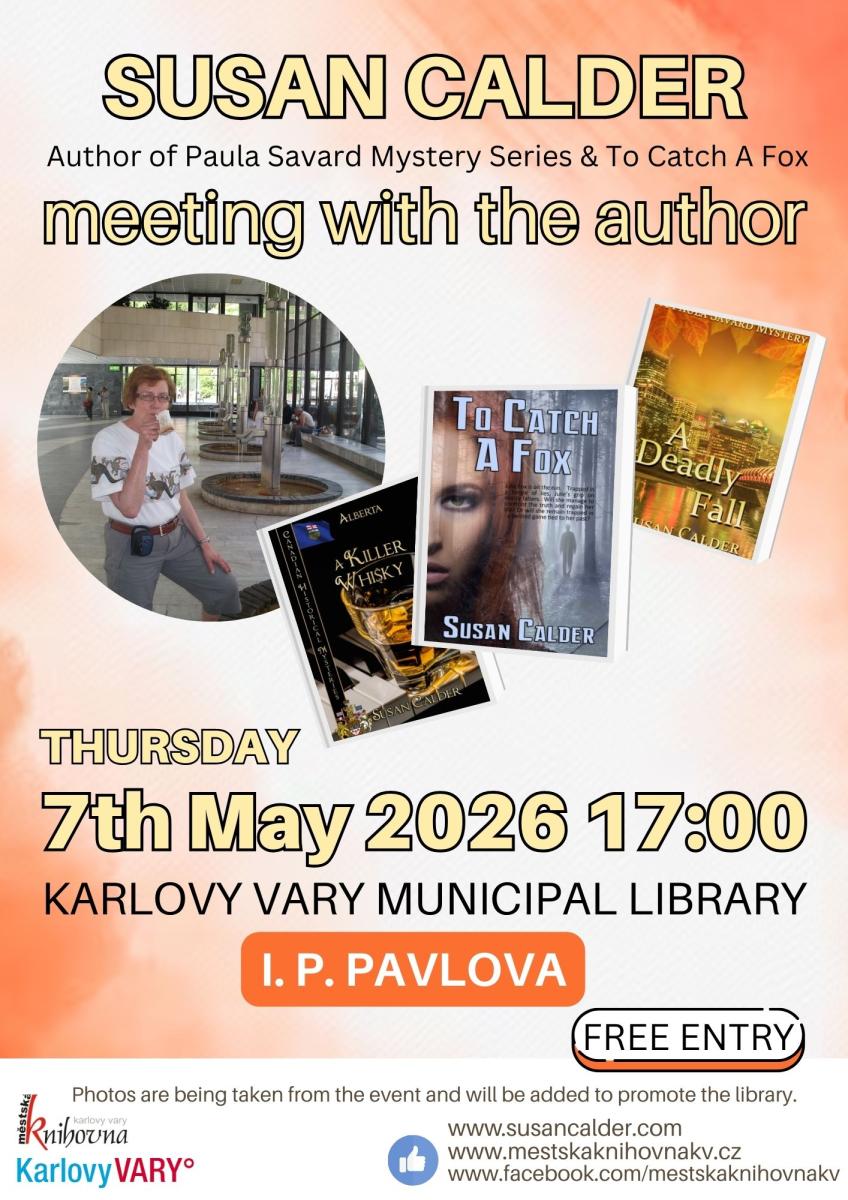 rádi bychom Vás pozvali na JEDINEČNÉ SETKÁNÍ s kanadskou autorkou detektivních románů - SUSAN CALDER. Poznejte spisovatelské řemeslo z daleké země. Objevte nové knihy a možná trochu procvičte angličtinu.