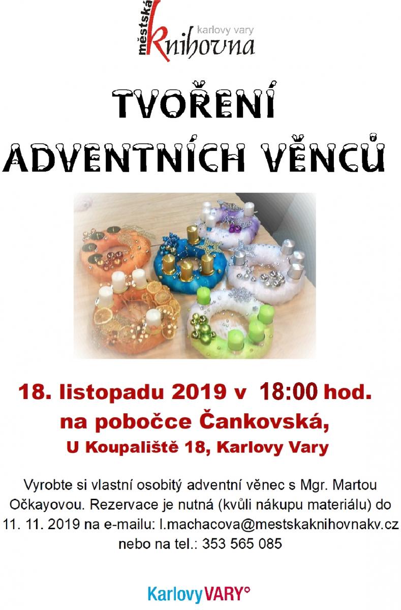 Přijďte si vyrobit v pondělí 18. listopadu 2019 v 18:00 hod. na pobočku Čankovská (U Koupaliště 18, Karlovy Vary) svůj osobitý adventní věnec s Mgr. Martou Očkayovou. Rezervace je nutná (kvůli nákupu materiálu) do 11. 11. 2019 na e-mailu: l [emailtecka] machacova