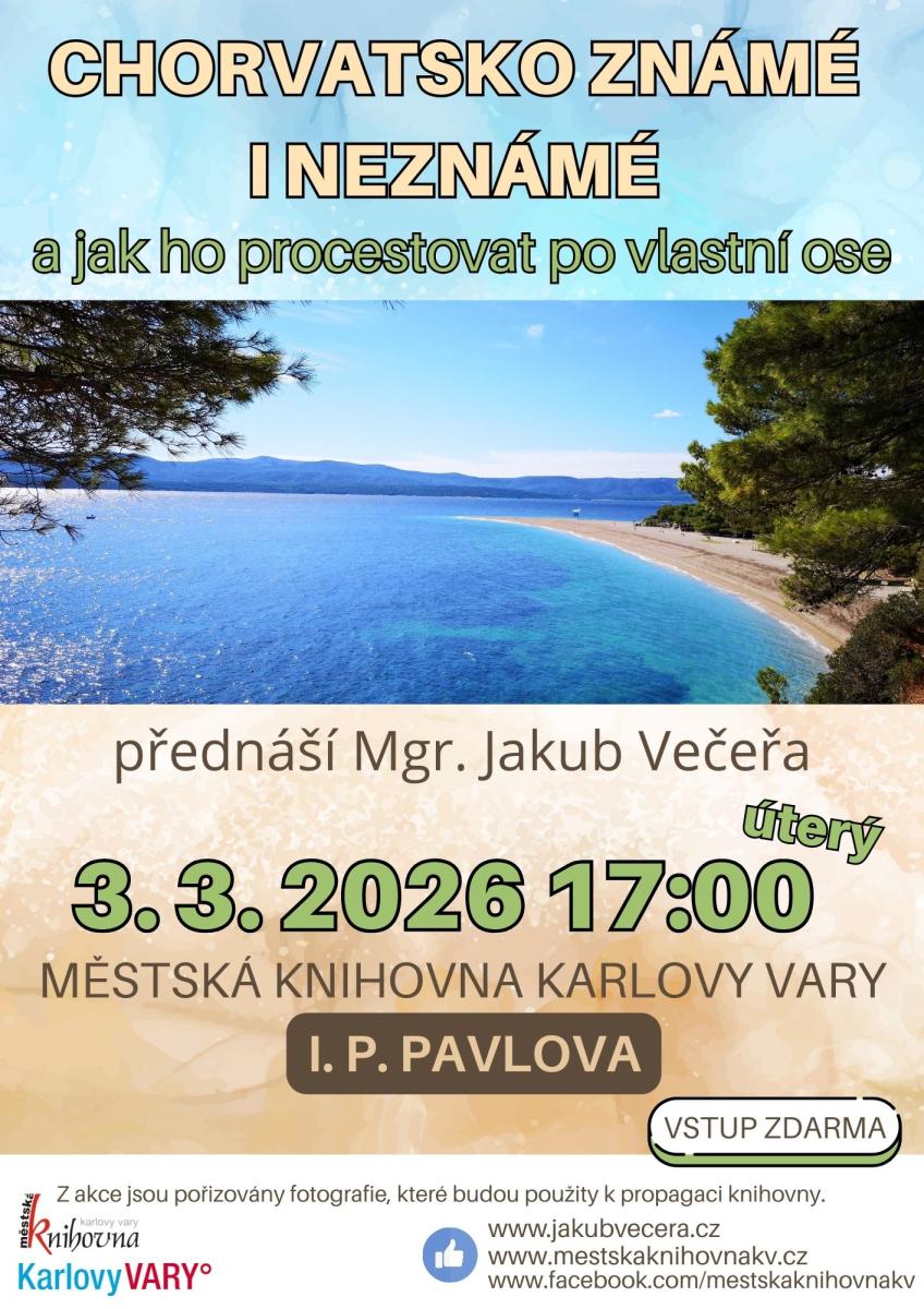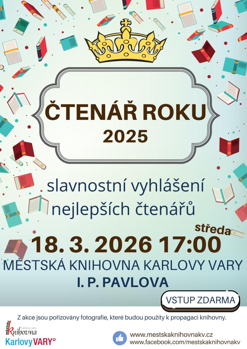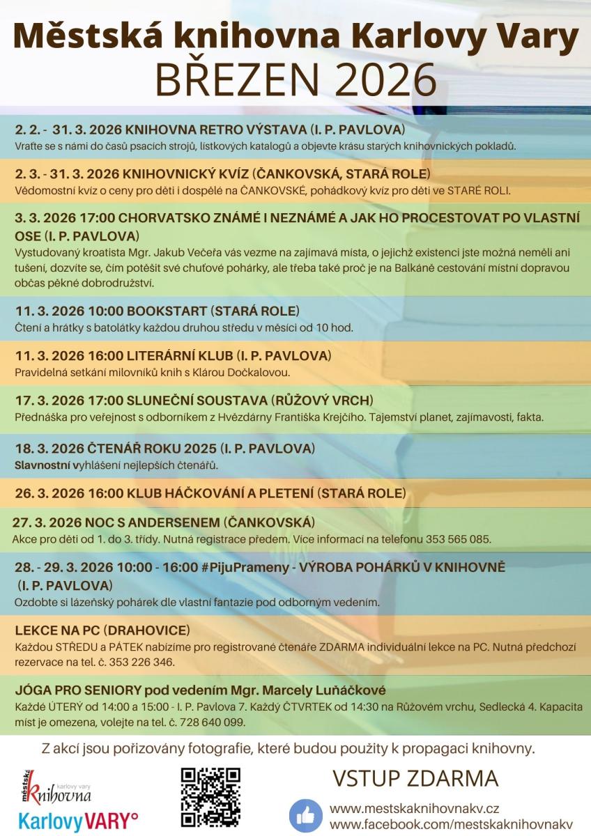 Milí čtenáři, blíží se nám březen, a to neznamená nic jiného než MĚSÍC ČTENÁŘŮ!!! Hned v pondělí u nás startují rovnou DVA vědomostní kvízy o velmi pěkné ceny - více se dozvíte na pobočkách ČANKOVSKÁ a STARÁ ROLE. V ÚTERÝ 3. 3. od 17:00 se s vystudovaným kroatistou vydáme vlastní cestou po Chorvatsku. 2. středu v měsíci nás opět čeká ve STARÉ ROLI od 10:00 BOOKSTART a v PŮJČOVNĚ PRO DOSPĚLÉ (I. P. PAVLOVA) LITERÁRNÍ KLUB od 16:00. V ÚTERÝ 17. 3. se vydáme na cestu SLUNEČNÍ SOUSTAVOU na RŮŽOVÉM VRCHU a den poté ve STŘEDU 18. 3. od 17:00 vyhlásíme v PŮJČOVNĚ PRO DOSPĚLÉ (I. P. PAVLOVA) NEJLEPŠÍ ČTENÁŘE ROKU 2025. Ve ČTVRTEK 26. 3. od 16:00 spolu budeme ve STARÉ ROLI háčkovat a v pátek 27. 3. nás čeká pohádková NOC S ANDERSENEM. Tento vzrušující měsíc zakončíme VÝROBOU LÁZEŇSKÝCH POHÁRKŮ dle vlastní fantazie v PŮJČOVNĚ PRO DOSPĚLÉ (I. P. PAVLOVA) o víkendu 28. a 29. 3. od 10:00!!!