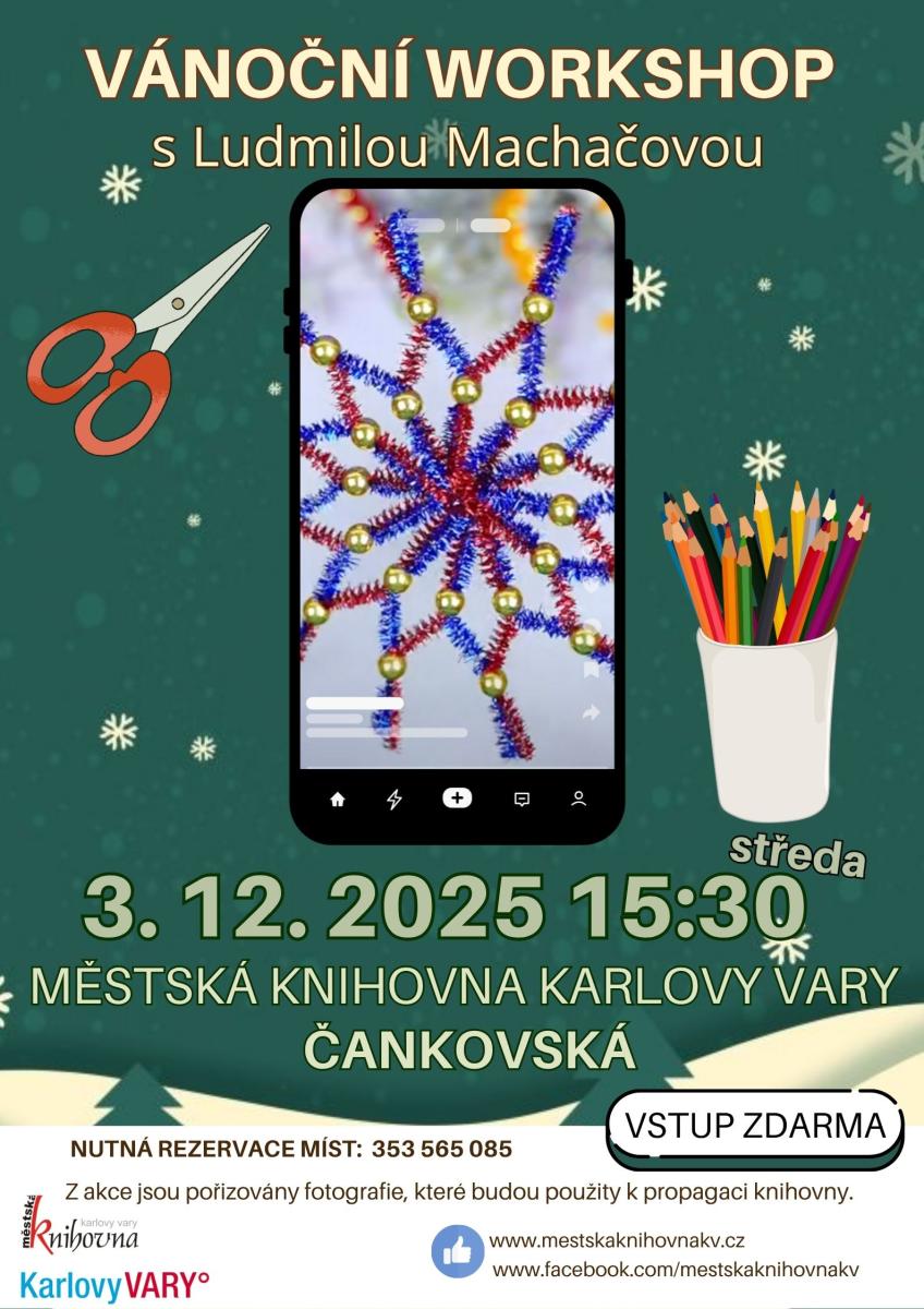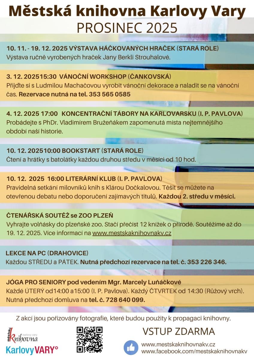 Vánoční ozdoby si můžete vyrobit i v PŮJČOVNĚ PRO DOSPĚLÉ (I. P. PAVLOVA) - každý adventní víkend se Vám budou věnovat zkušení lektoři z Domu dětí a mládeže, Adventní workshopy budou probíhat od 14:00 do 17:30. 4. 12. od 17:00 s PhDr. Bružeňákem prozkoumáme karlovarskou historii a objevíme zapomenuté koncentrační tábory.  A 10. 12. se opět uvidíme ve ČTENÁŘSKÉM KLUBU.