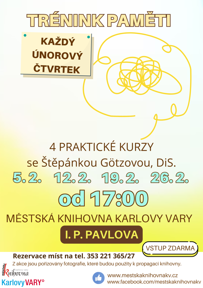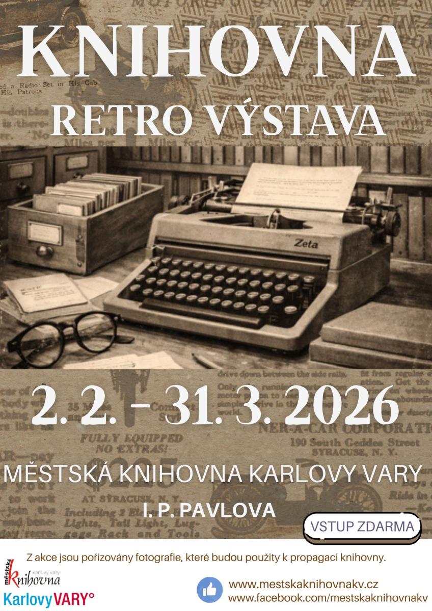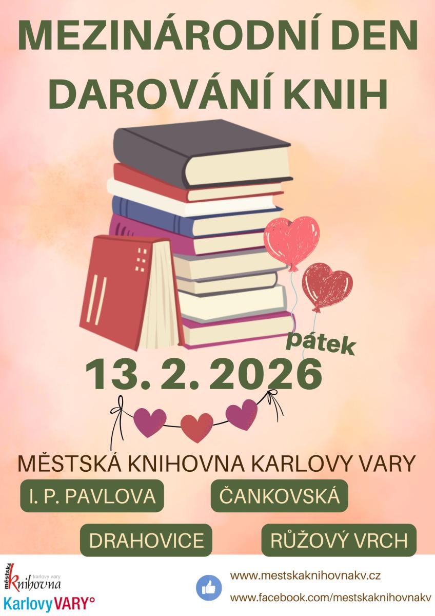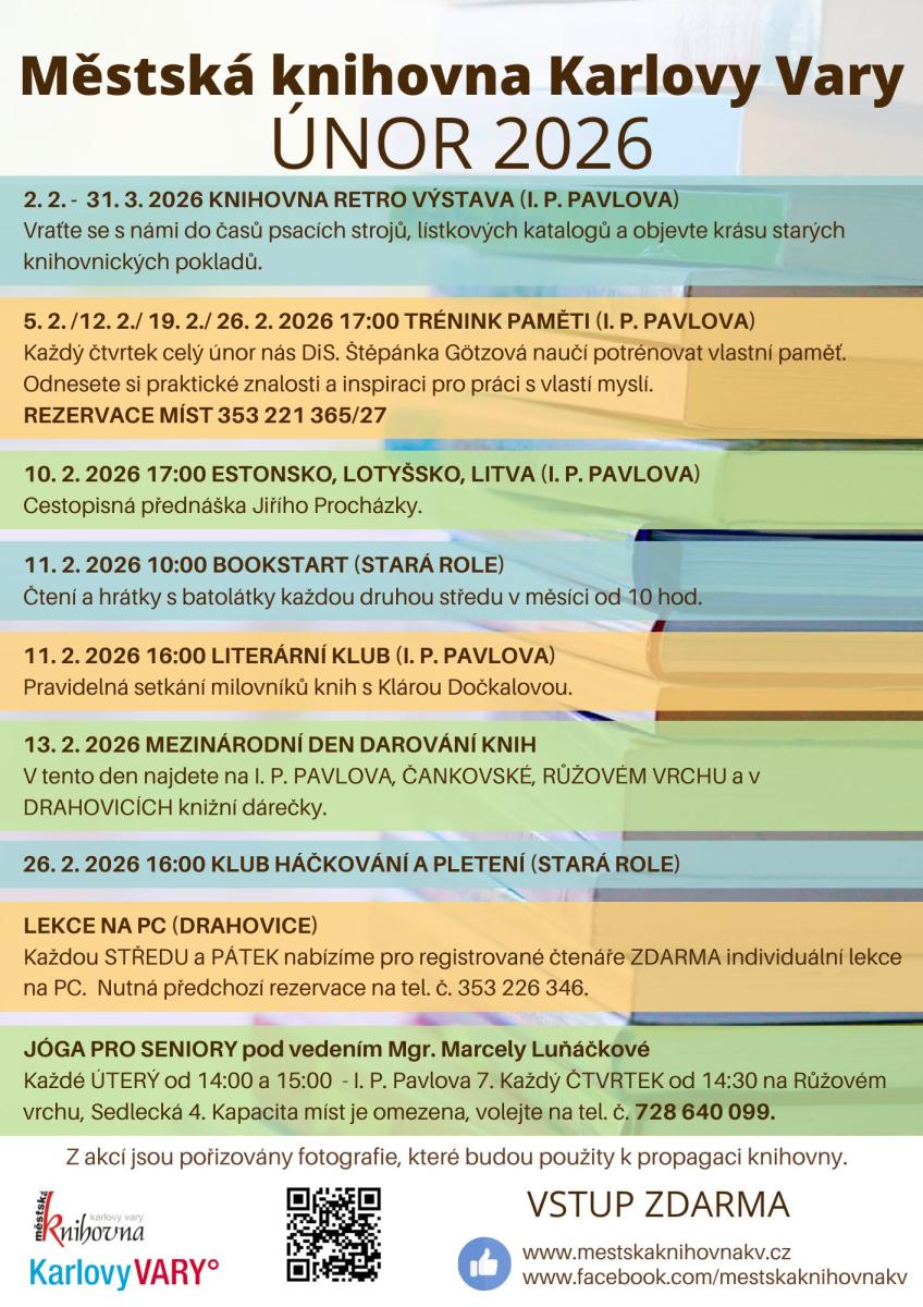 rádi bychom Vás pozvali na naše únorové akce. Hned v PONDĚLÍ 2. 2. startuje v PŮJČOVNĚ PRO DOSPĚLÉ (I. P. PAVLOVA) nová výstava, která Vás přenese do dob minulých, kdy jsme psali na strojích a naším Googlem byl lístkový katalog. Máte toto období zastřené mlhou? Tento neduh vyřeší TRÉNINK PAMĚTI pod vedením Štěpánky Götzové, KAŽDÝ ÚNOROVÝ ČTVRTEK procvičíme naši mysl od 17:00 v PŮJČOVNĚ PRO DOSPĚLÉ (I. P. PAVLOVA) - svá místa si nezapomeňte VČAS ZAREZERVOVAT 353 221 365 (linka 27). V ÚTERÝ 10. 2. se z PŮJČOVNY PRO DOSPĚLÉ (I. P. PAVLOVA) v 17:00 přeneseme na dobrodružnou cestu Pobaltím s Jiřím Procházkou a jeho čtyřnohým kamarádem Fenrim. Již ve STŘEDU 11. 2.od 10:00 ve STARÉ ROLI pořádáme oblíbený BOOKSTART - akci pro nejmenší, budeme si hrát a objevovat kouzlo knížek. Tentýž den od 16:00 se v PŮJČOVNĚ PRO DOSPĚLÉ opět setkají největší knihomolové, tentokrát budeme debatovat o beletrii jako takové. Co by to bylo za únor bez MEZINÁRODNÍHO DNE DAROVÁNÍ KNIH, letos se uskuteční v PÁTEK 13. 2. na I. P. PAVLOVA a pobočkách ČANKOVSKÁ, DRAHOVICE a RŮŽOVÝ VRCH. Nezapomeňte, že v pátek mají naše pobočky otevřeno až od 12:00. Ve ČTVRTEK 26. 2. od 16:00 budeme zase ve STARÉ ROLI háčkovat a plést. V DRAHOVICÍCH stále můžete vylepšit své dovednosti na PC (po předchozí rezervaci termínu 353 226 346).